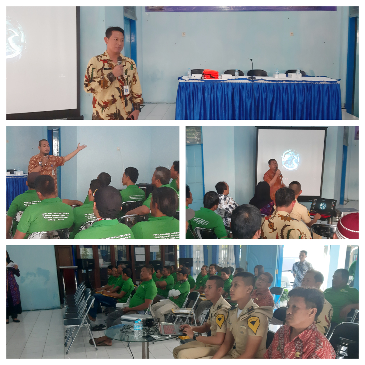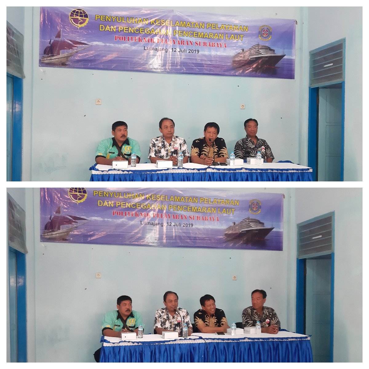 Drs. Teguh Pribadi, M.Si., QIA, yang mewakili jajaran Manajaemen POLTEKPEL Surabaya mengutarakan dalam sambutannya, apa tujuan dari adanya penyuluhan ini untuk memberikan hal-hal yang seharusnya dilakukan oleh bapak-ibu nelayan sesuai dengan aturan pada saat akan atau saat menangkap ikan di laut, baik persiapan di darat maupun di atas perahu nelayan. Beliau menyampaikan pula penyebab timbulnya ancaman